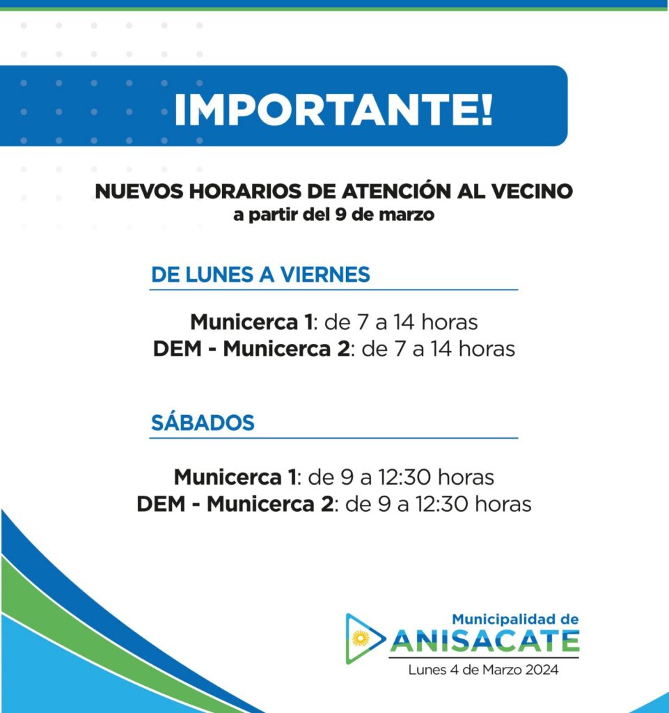 La Municipalidad de Anisacate informa que a partir del 9 de marzo se modificarán los horarios de atención al vecino los días sábados.