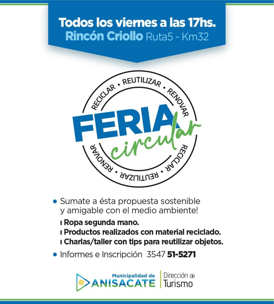 La Municipalidad de Anisacate te invita todos los viernes a una experiencia de creatividad y conciencia ambiental, en el Rincón Criollo. Organizado por la Dirección de Turismo, el Área de Ambiente y feriantes locales, este evento busca promover el reciclado, rehusado y reinventado. En la Feria Circular habrá productos de segunda mano, vintage, prendas […]