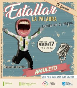La Dirección de Educación, dependiente de la Secretaría de Gestión Pública del Gobierno de Alta Gracia, invita a una nueva edición del encuentro de poesía Estallar la Palabra, que se realizará el viernes 17 de febrero de 19 a 22 horas en el patio de Casa de la Cultura.