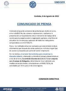 “Esto se debe a que hemos solicitado la reapertura de paritarias del segundo semestre del año y tras varia audiencias donde lamentablemente no ha habido ningún tipo de propuesta ni acercamiento por parte de los empresarios del sector del transporte. Se encuentran en una postura inflexible de que el salario está vinculado con los subsidios y las tarifas, por lo que no nos queda otra y que esta medida de acción directa”, expresó.