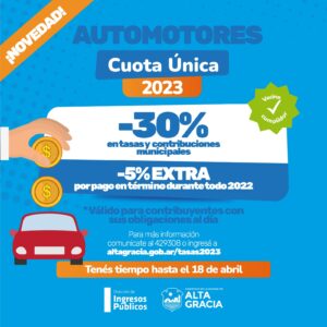 La Dirección de Ingresos Públicos dependiente de la Secretaría de Economía y Finanzas del Gobierno de Alta Gracia informa que se encuentra disponible la posibilidad de acceder a un descuento del 30% en su contribución automotor 2023. Para acceder a este beneficio, destinado a contribuyentes que estén al día y que abonen sus obligaciones para este año mediante Cuota Única, hay tiempo hasta el 18 de abril.