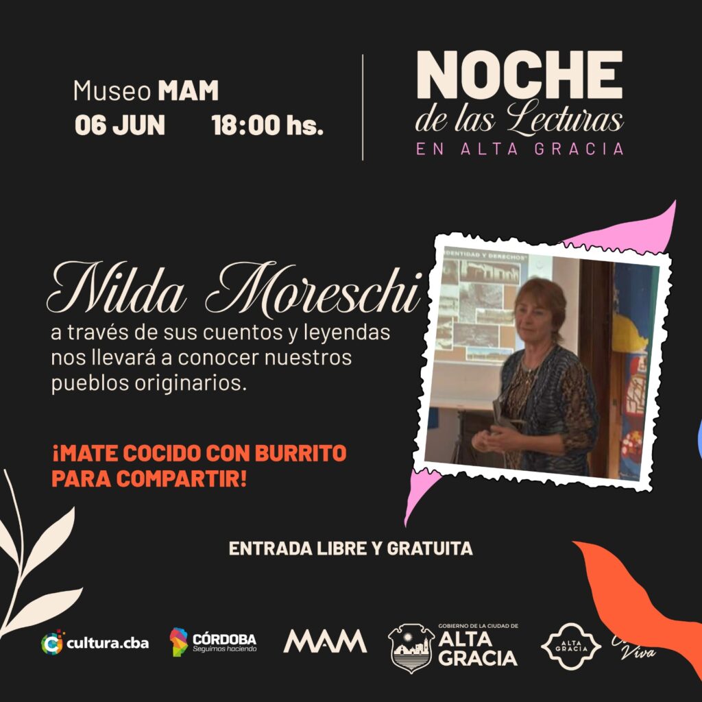 18hs MAM – Museo Arqueológico Municipal: El museo se suma para compartir con los lectores una noche de relatos sobre nuestros pueblos originarios, con la presencia de la escritora e investigadora local, Nilda Moreschi, quien a través de sus cuentos y leyendas nos llevará a conocer a nuestros antepasados, los Comechingones. Se brindará mate cocido con burrito para los asistentes.