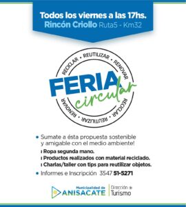 La Municipalidad de Anisacate te invita todos los viernes a una experiencia de creatividad y conciencia ambiental, en el Rincón Criollo. Organizado por la Dirección de Turismo, el Área de Ambiente y feriantes locales, este evento busca promover el reciclado, rehusado y reinventado.