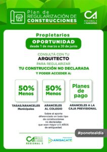 La Municipalidad de Anisacate informa que se ha extendido el convenio con el Colegio de Arquitectos para regularizar las construcciones No declaradas – Descuento del 50 % en liquidacion de planos de relevamiento para viviendas con mas de 5 años de antiguedad.
